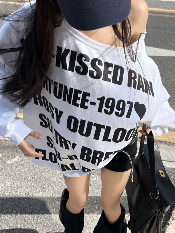Schulterfreies Oversized Langarm T-Shirt mit Buchstaben Aufdruck