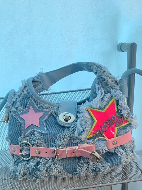 Denim-Umhängetasche mit roher Kante und Sternschnalle