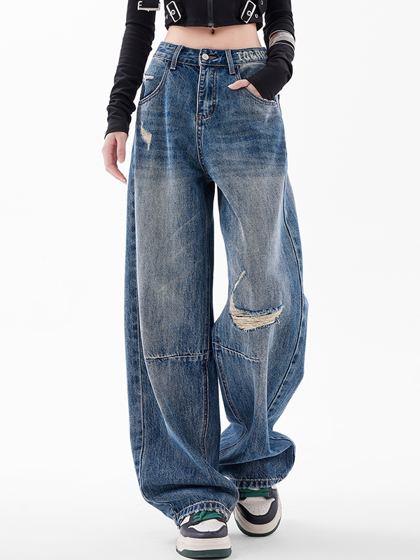 Gerade geschnittene, lockere Raglan-Jeans mit Rissen