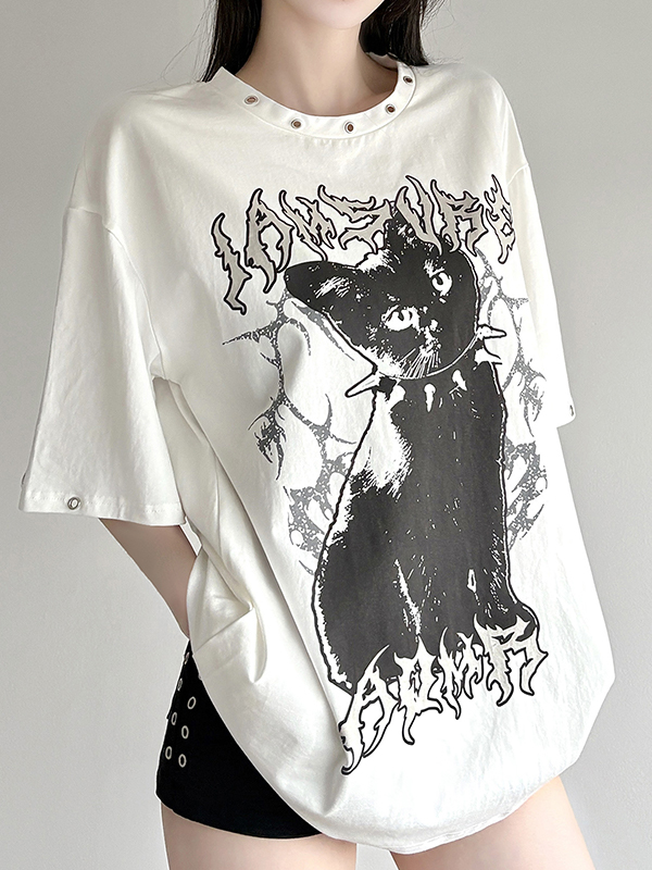 Lockeres T-Shirt mit dunklem Katzen-Print und perforiertem Rundhalsausschnitt