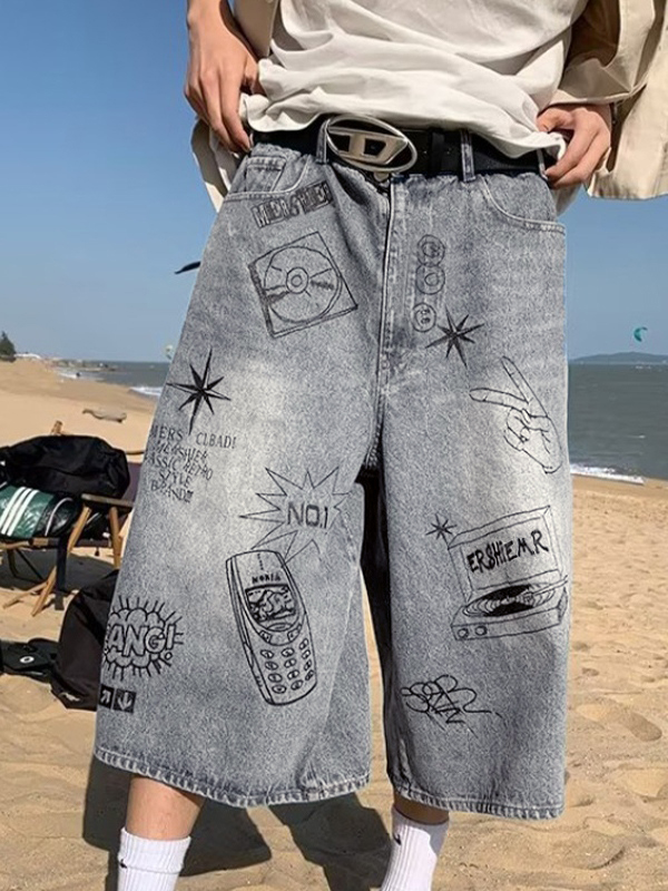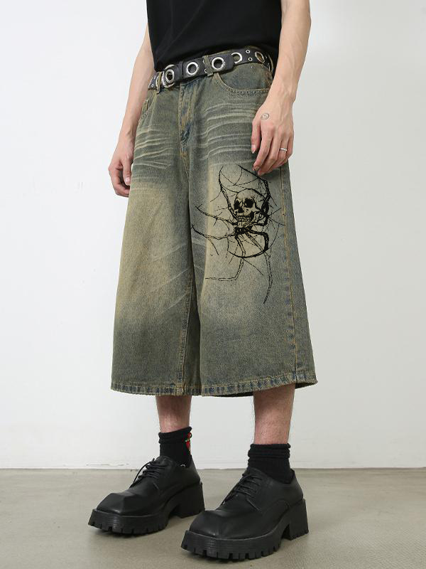 Lockere Jeansshorts für Herren mit Totenkopf- und Spinnen-Print