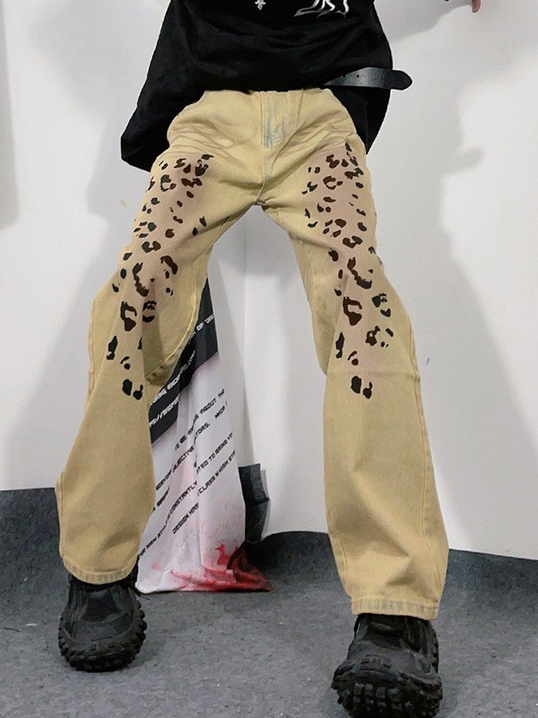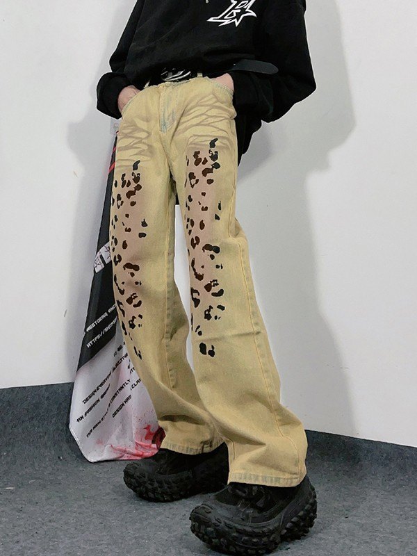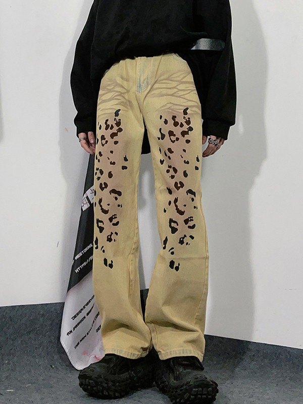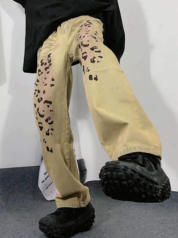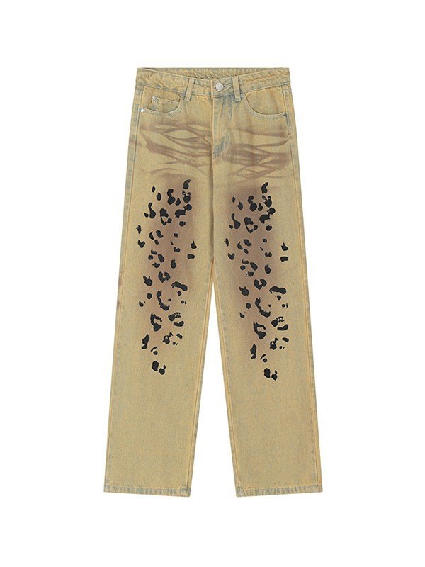 Beschreibung: Holen Sie sich Jeans im Wildtier-Stil in Ihre Denim-Garderobe , es ist retro. Diese Herrenjeans hat eine tailliert geschnittene Silhouette, ist aus Baumwollmischgewebe mit Retro-Waschung und hat gefärbte Effekte am Bein, sie hat einen Leopardenmusterdruck, wird mit einem Knopfverschluss geschlossen und hat ein Design mit 5 Jeanstaschen.
